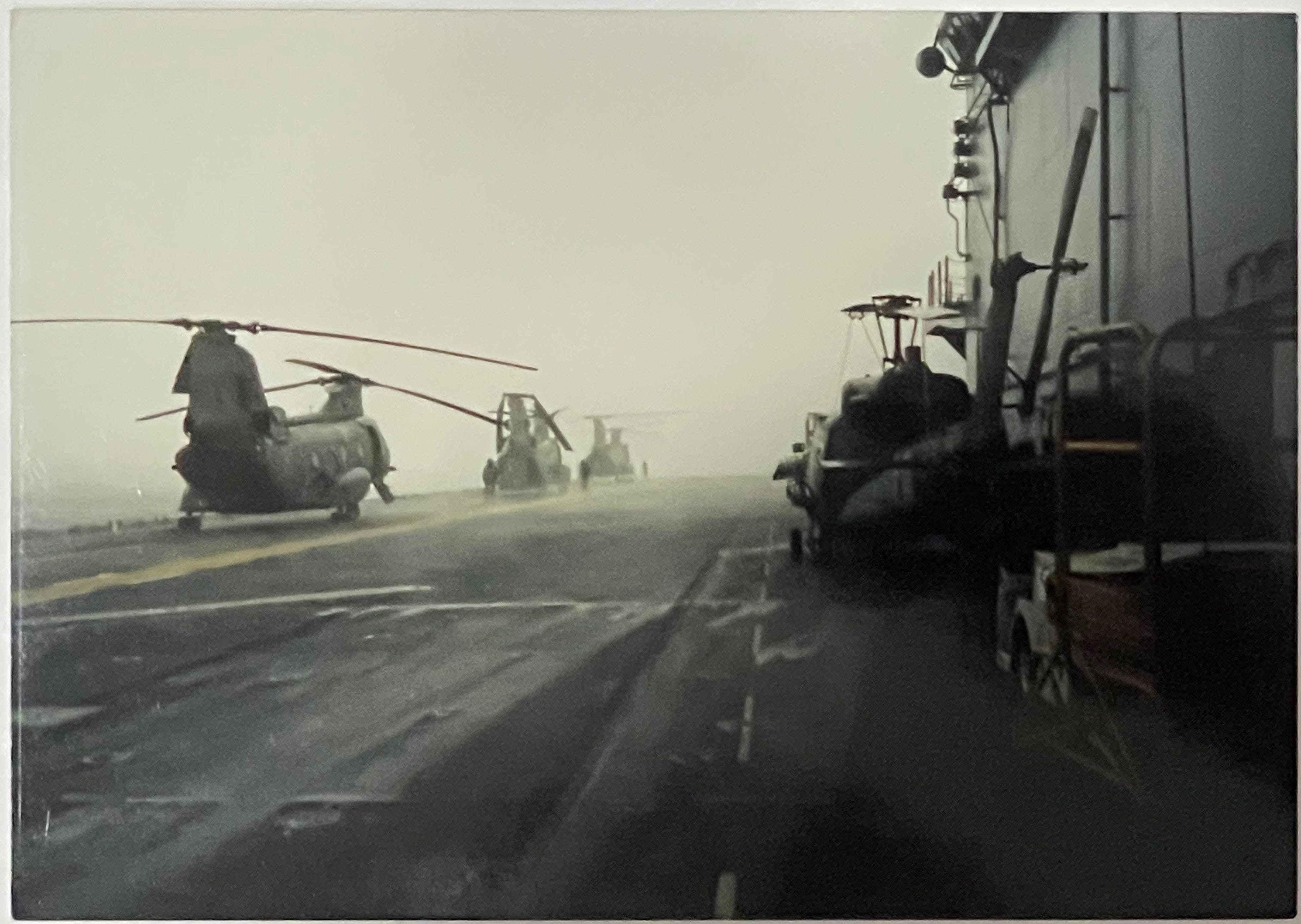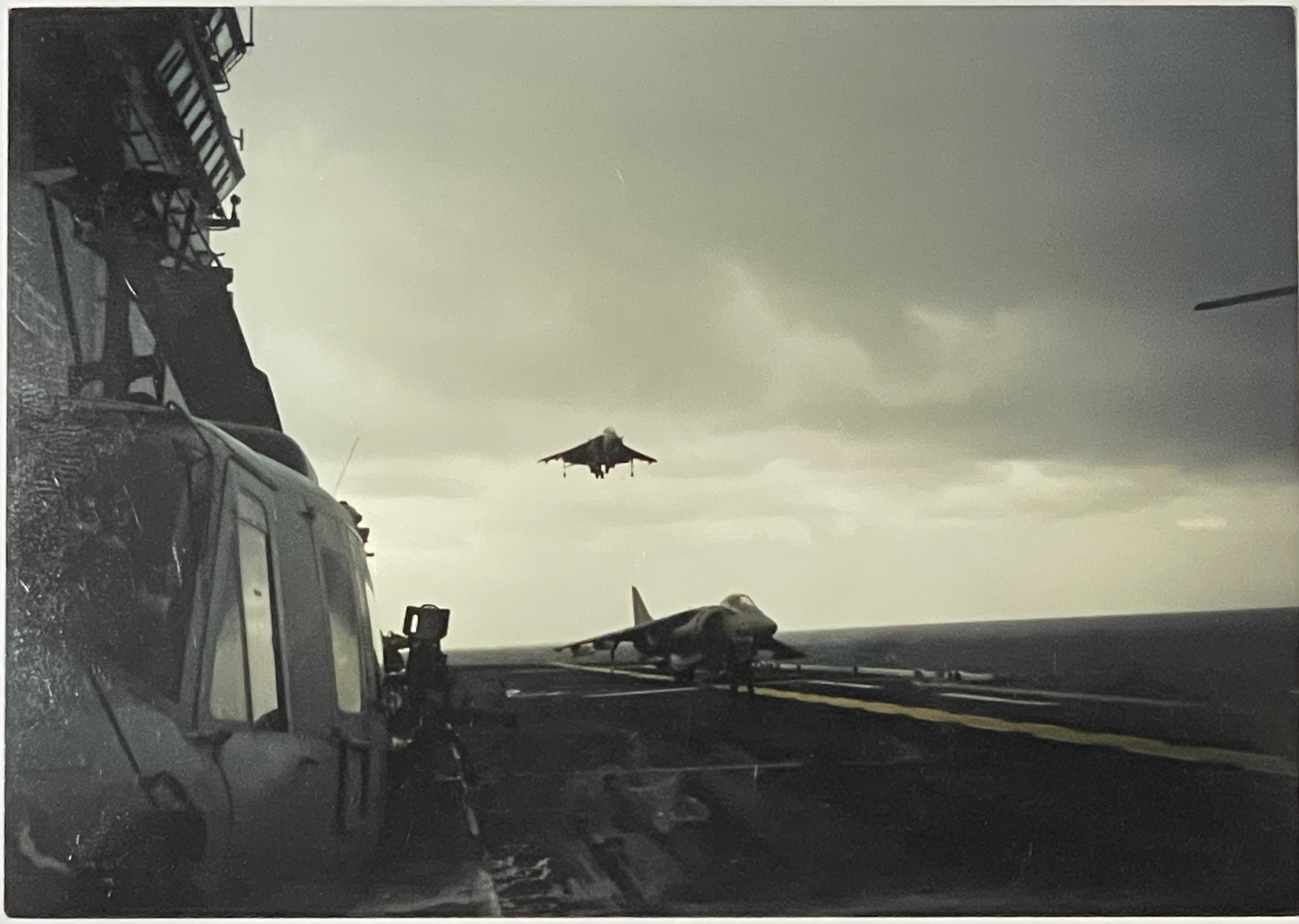 My first intro to the iron gonads of our Harrier pilots came before I’d even met any of them. During our fly-aboard to the ship, the weather off the North Carolina coast was starting to degrade that late-March day, 1995. There are only 8 landing spots aboard a helicopter carrier, so each “wave” of aircraft has a particular window to get aboard, shut down, and quickly get pulled off of the spots (and stored) in order to make room for the next wave. The Cobra time slot was right before the Harriers and we managed to sneak in under the clouds.
